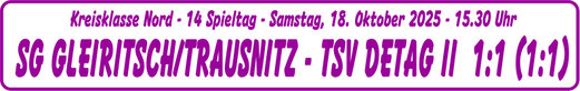 Im Kellerduell der Kreisklasse Nord lieferten sich die SG Gleiritsch/Trausnitz und der TSV Detag Wernberg II ein Duell auf Augenhöhe. Nach ausgeglichenem Beginn kamen die Gäste ... weiterlesen SPIELDATEN