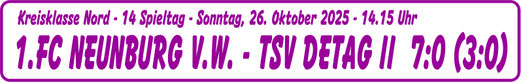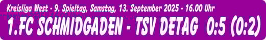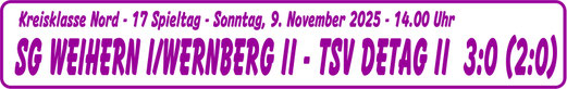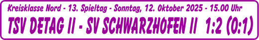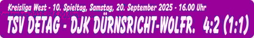 Zwei Spiele ohne eigenen Treffer gab es lange nicht mehr für den TSV Detag Wernberg. Nach der 0:1-Niederlage in OVI mussten sich die Lila-weißen trotz deutlicher Überlegenheit ... weiterlesen SPIELDATEN