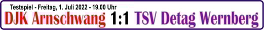 In einem intensiven Testspiel kam der TSV Detag Wernberg bei Bezirksligaabsteiger DJK Arnschwang nicht über ein 1:1-Unentschieden hinaus. In der Anfangsphase ließen die Köblitzer bei klarer Überlegenheit einige gute Chancen zur Führung liegen, dann bauten sie den Gegner durch zu unpräzise Anspiele ins Zentrum auf, so dass auch dieser seine Chancen bekam. Mit dem Halbzeitpfiff dann der Arnschwanger Führungstreffer, der nach klarer Abseitsstellung und einem verwandelten Foulelfmeter zustande kam. Im zweiten Abschnitt befanden sich die Lila-weißen zwar ständig im Vorwärtsgang und hatten auch einige Möglichkeiten, die jedoch nicht verwertet wurden. Lediglich dem eingewechselten Thimo Luff gelang durch einen verwandelten Handelfmeter der hoch verdiente Ausgleich (68.). SPIELDATEN